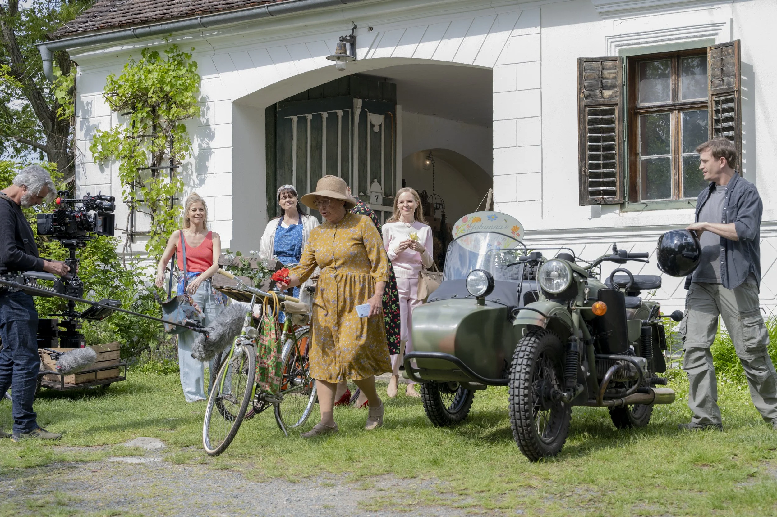 Bild unten rechts. Vor dem Hofladen im idyllischen Buchschachen treffen sich Hilde Dalik (Vera), Eva-Maria Marold (Johanna), Ingrid Singer (Mitzi), Julia Koch (Eva) und Michael Steinocher (Finz).