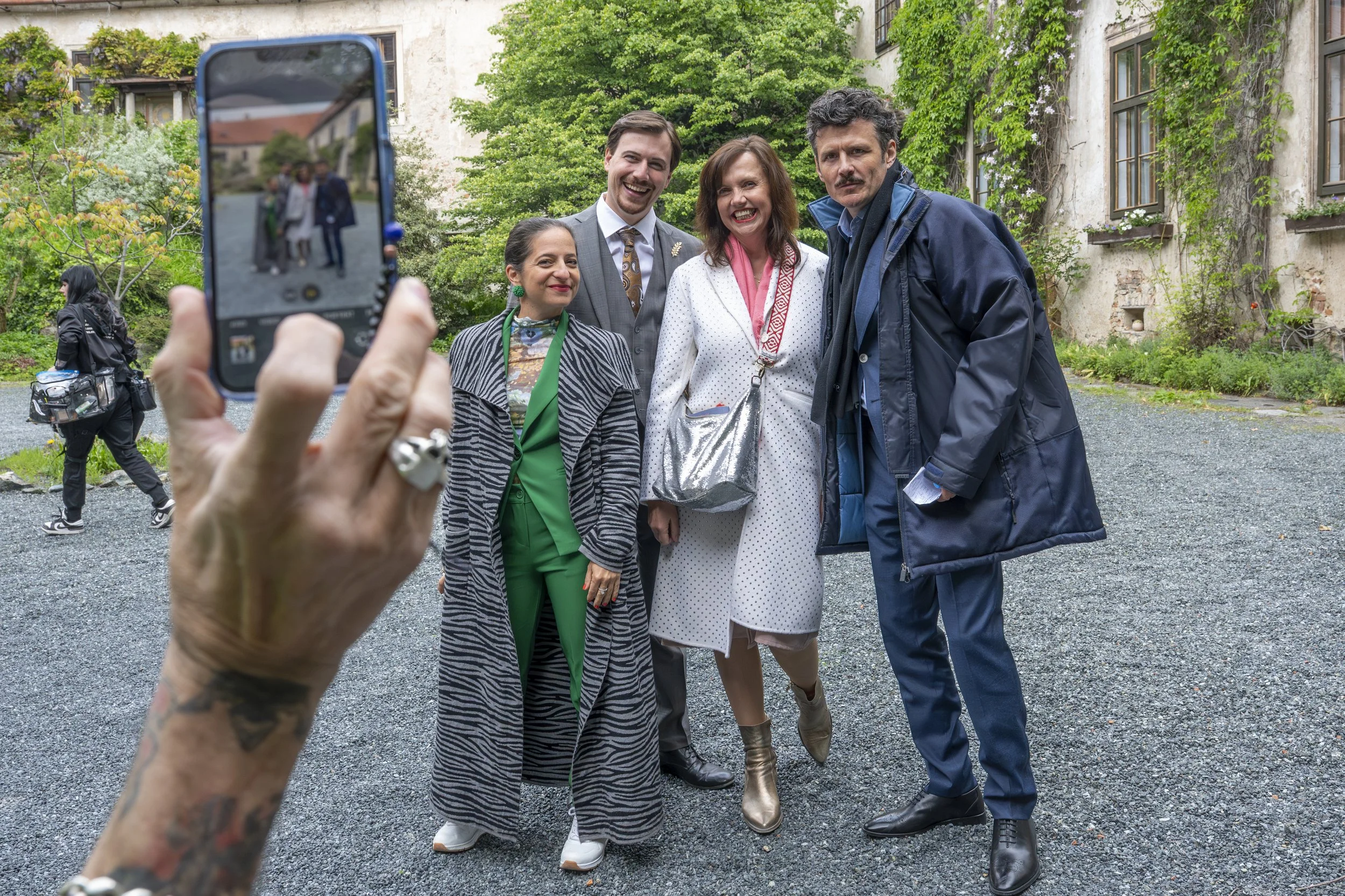 Bild oben. Caroline Athanasiadis (spielt eine Grün-Politikerin), Pascal Giefing (der Bürgermeister), Manuel Rubey (Paul) und ich beim Dreh auf Burg Berstein. Ich hatte an diesem Tag einen Cameo-Auftritt als Gemeinderätin.