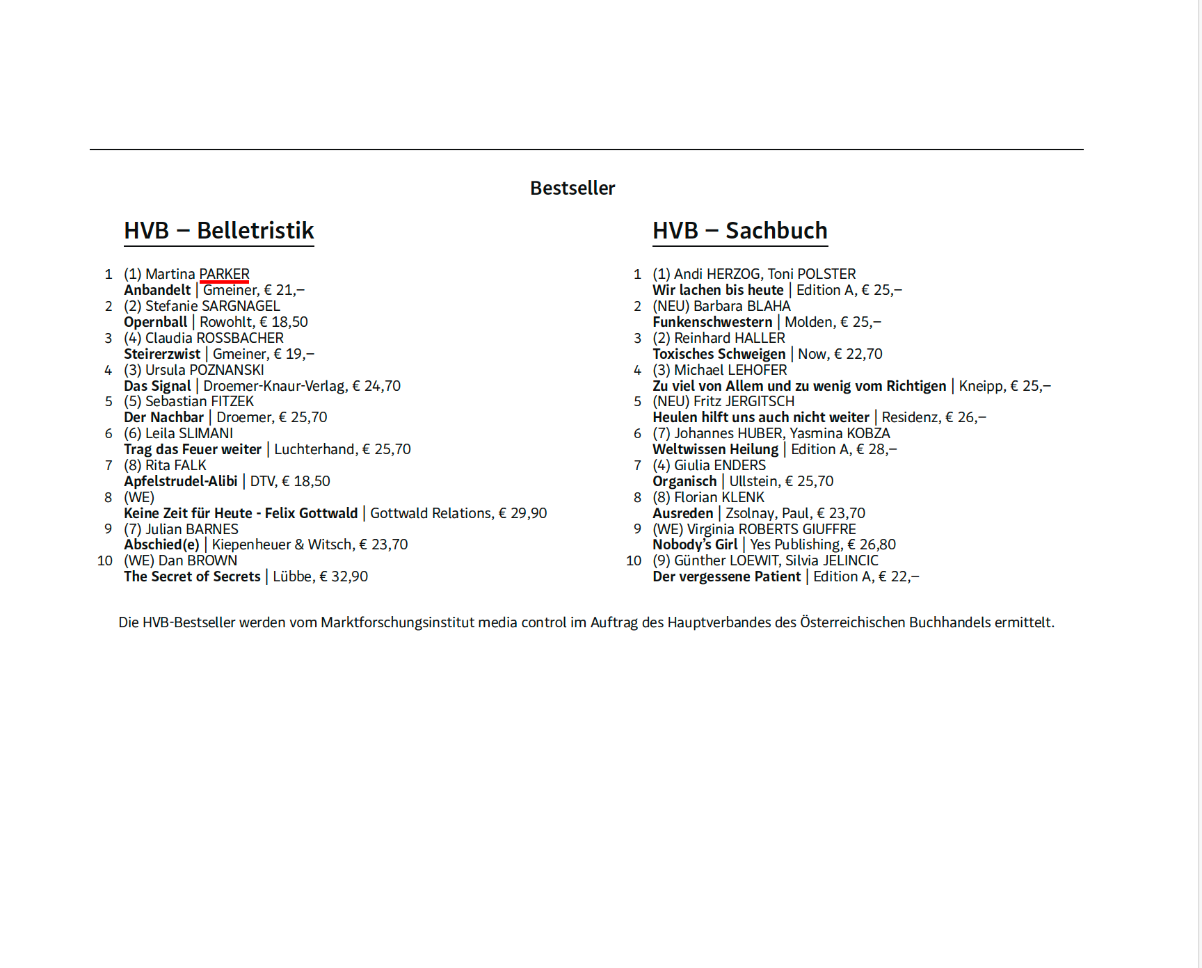 Der Standard: Bestseller 21.2.26 Martina Parker21. Februar 2026Kommentieren Facebook0 Twitter Tumblr 0 Likes